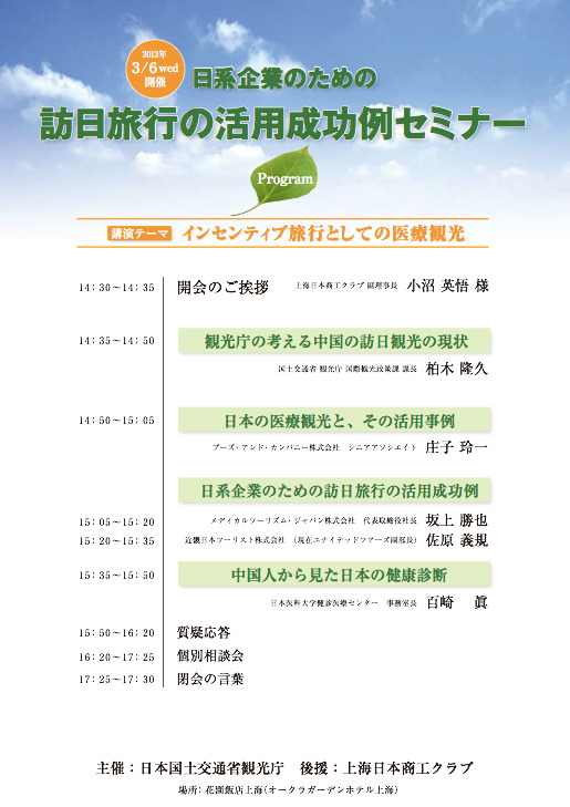 国土交通省観光庁(主催)上海日本商工クラブ(後援)の「訪日旅行の活用セミナー 〜インセンティブ旅行としての医療観光〜」にて、坂上勝也代表取締役が演者として参加します。